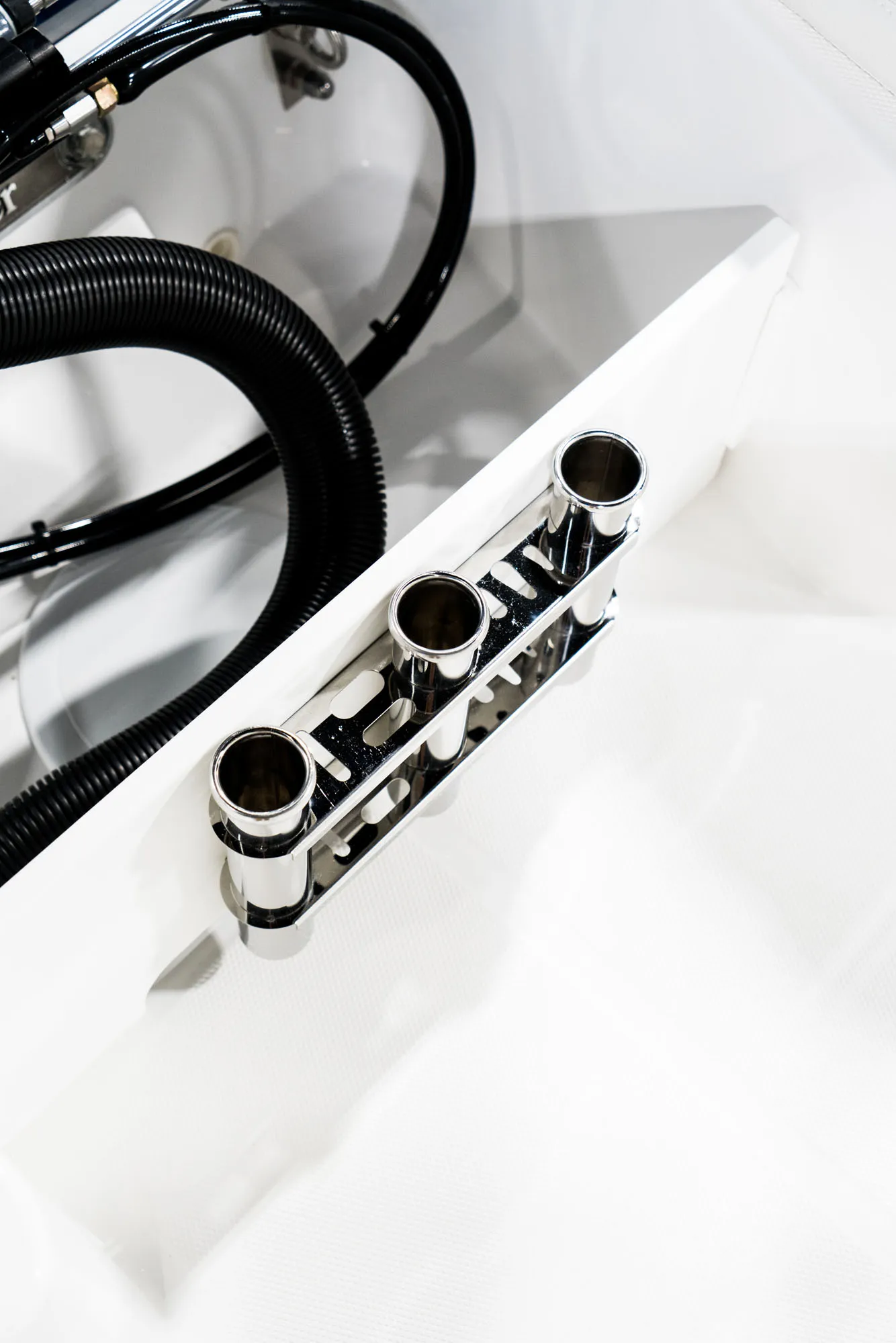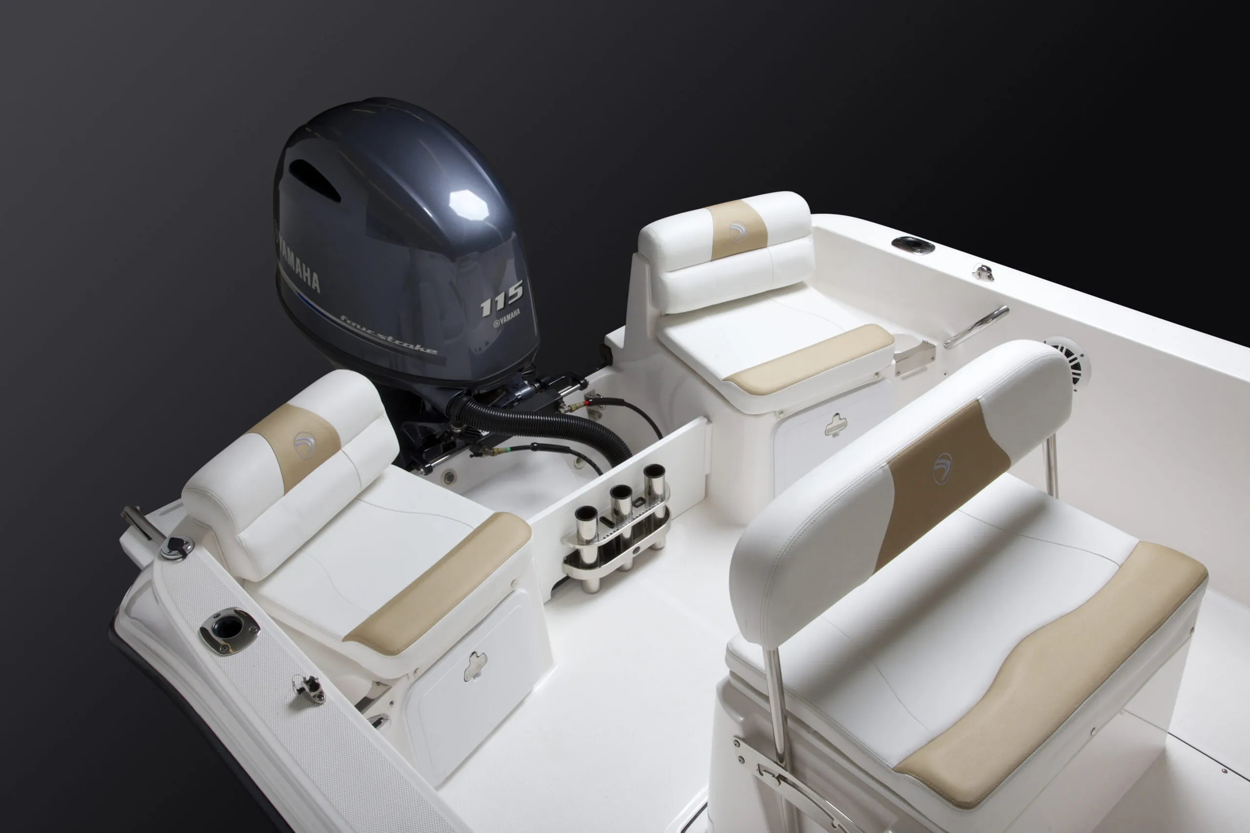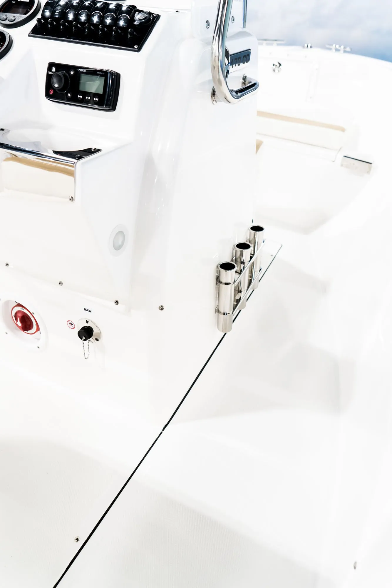 - Fishing Package: 17 gal Baitwell, Raw Water Washdown, Extra Gunwale Rod Holders, Stainless Steel Console Rod Racks, Built-In Stern Mounted Tackle Box